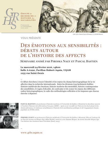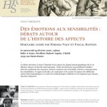 département d’histoire de l’Université du Québec à Montréal, vous convient au séminaire « Des émotions aux sensibilités: débat autour de l’histoire des affects » qu’ils animeront. Le séminaire se tiendra à 14h, salle A-6290.